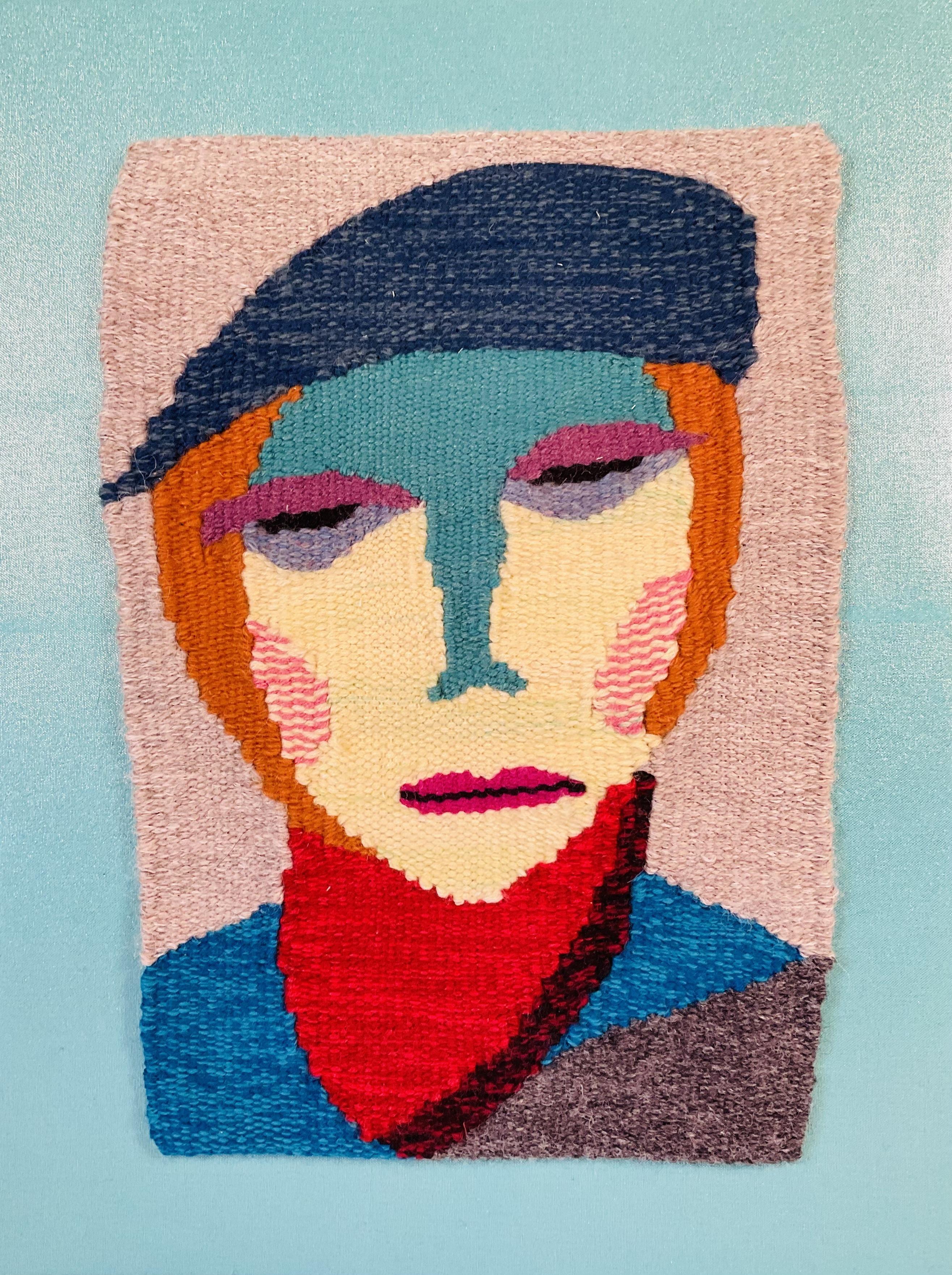 Description: Handwoven tapestry woven on a Merrix tapestry loom. Fibers include blended wool and silk/wool yarns, some hand painted. The original design of a woman’s face wearing a blue cap and a red bandana. The tapestry is hand sewn onto fabric-covered stretched canvas.
