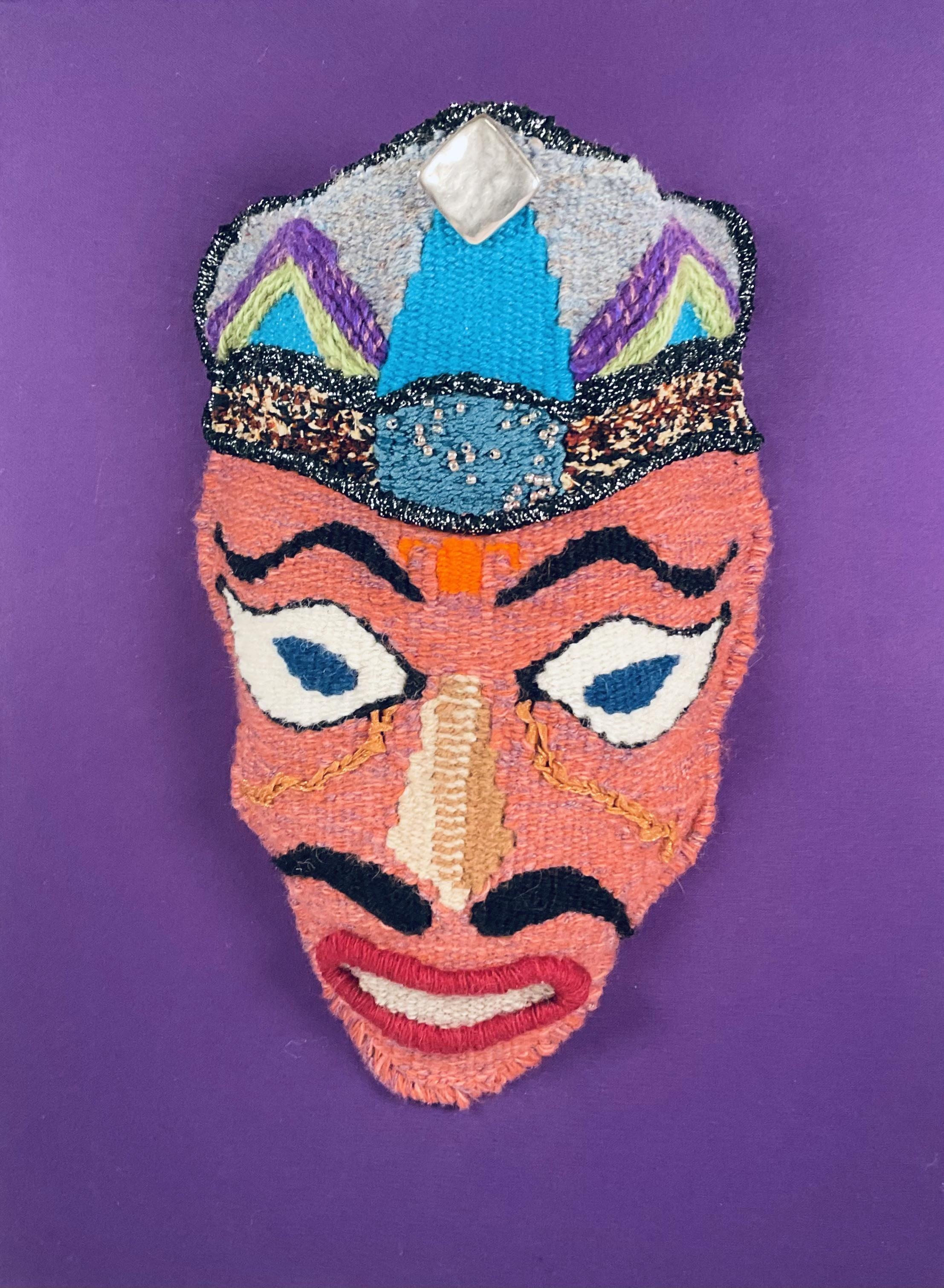 Description: Handwoven tapestry of blended wool yarns, batik fabric, ribbon, paper fiber rush, metallic thread, silver, metal, and glass beads, and fiberfill batting. Original design influenced by Javanese dance mask or wayang topeng.