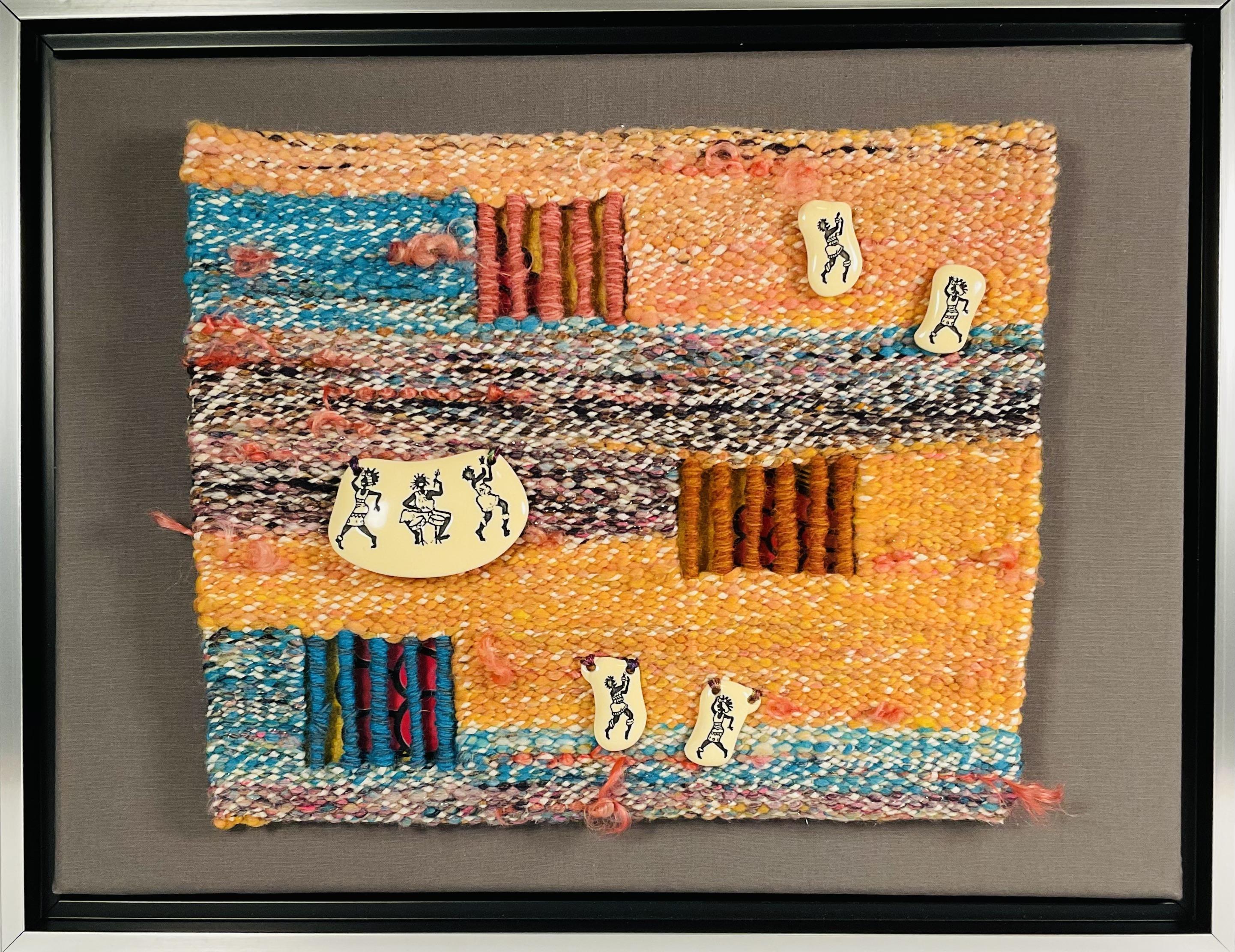 Description: Small format tapestry woven with handspun art yarn and wrapped threads above a background of colorful floral print fabric. Plastic pendants of dancing women are sewn onto the surface of the tapestry.