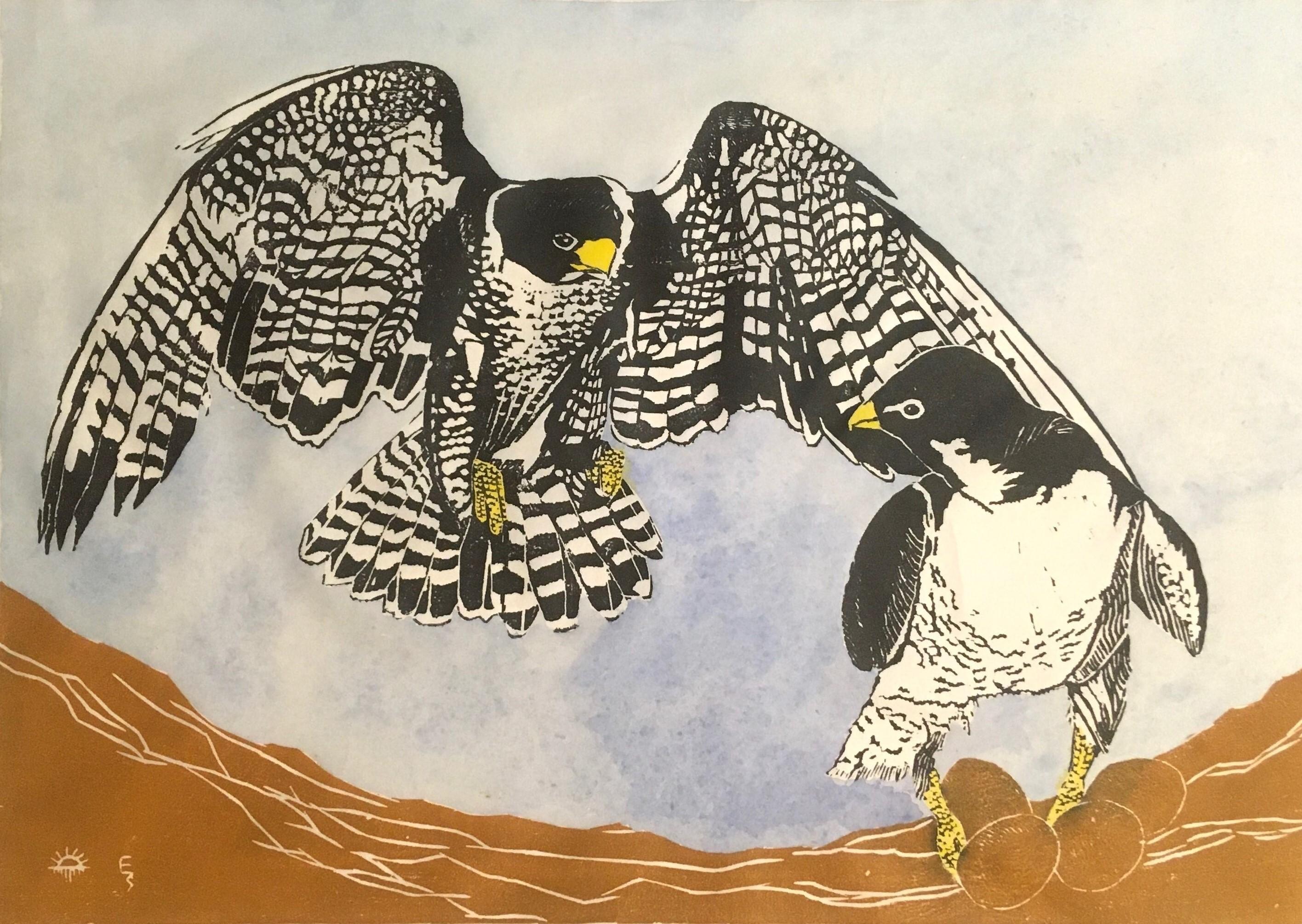 Description: Block carved 1990, this print # 142 printed in 2013, of a Peregrine Falcon pair at their nest.