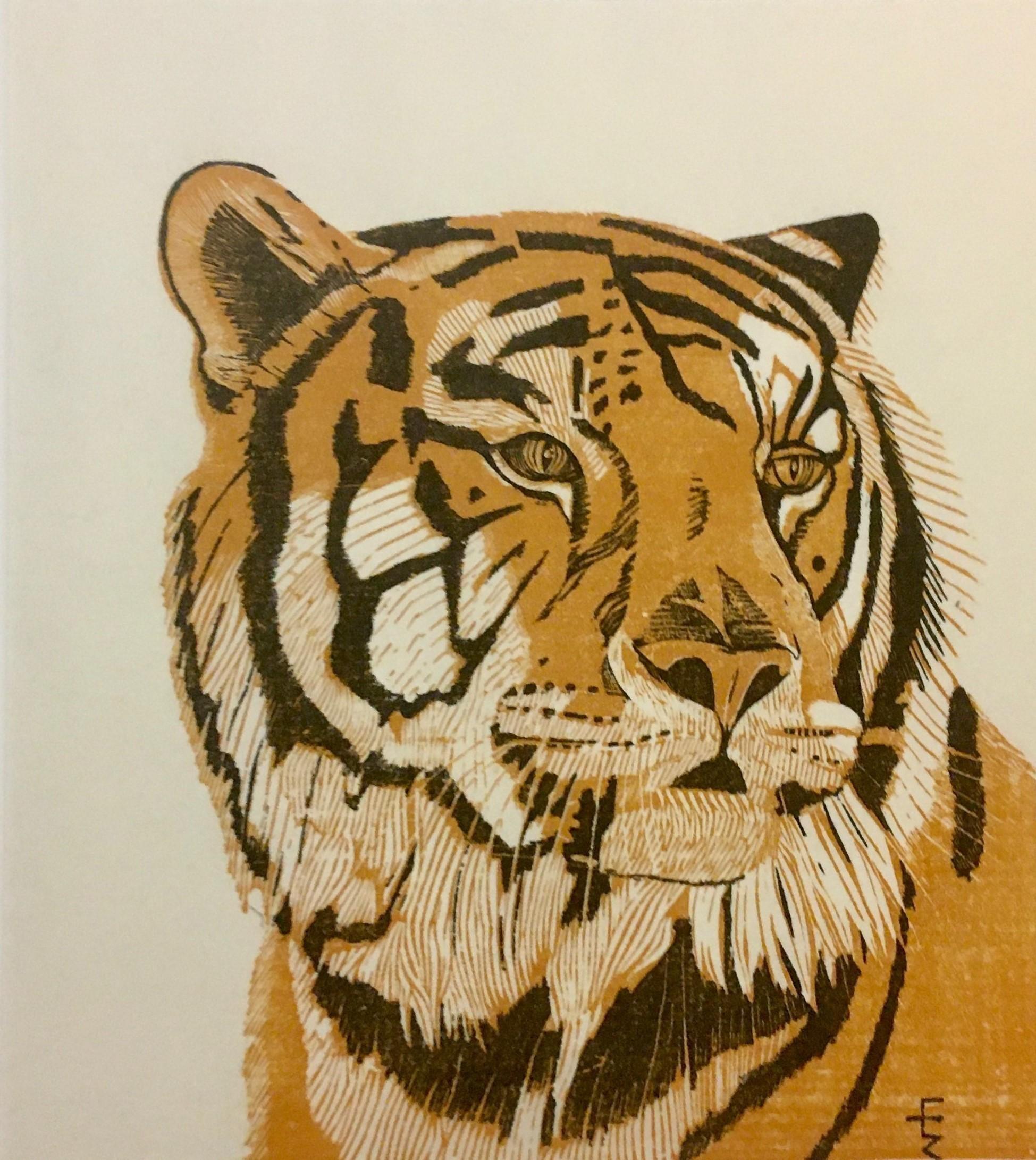 Description: Block carved in 2001; this print # 22 printed in 2020, of a tiger.